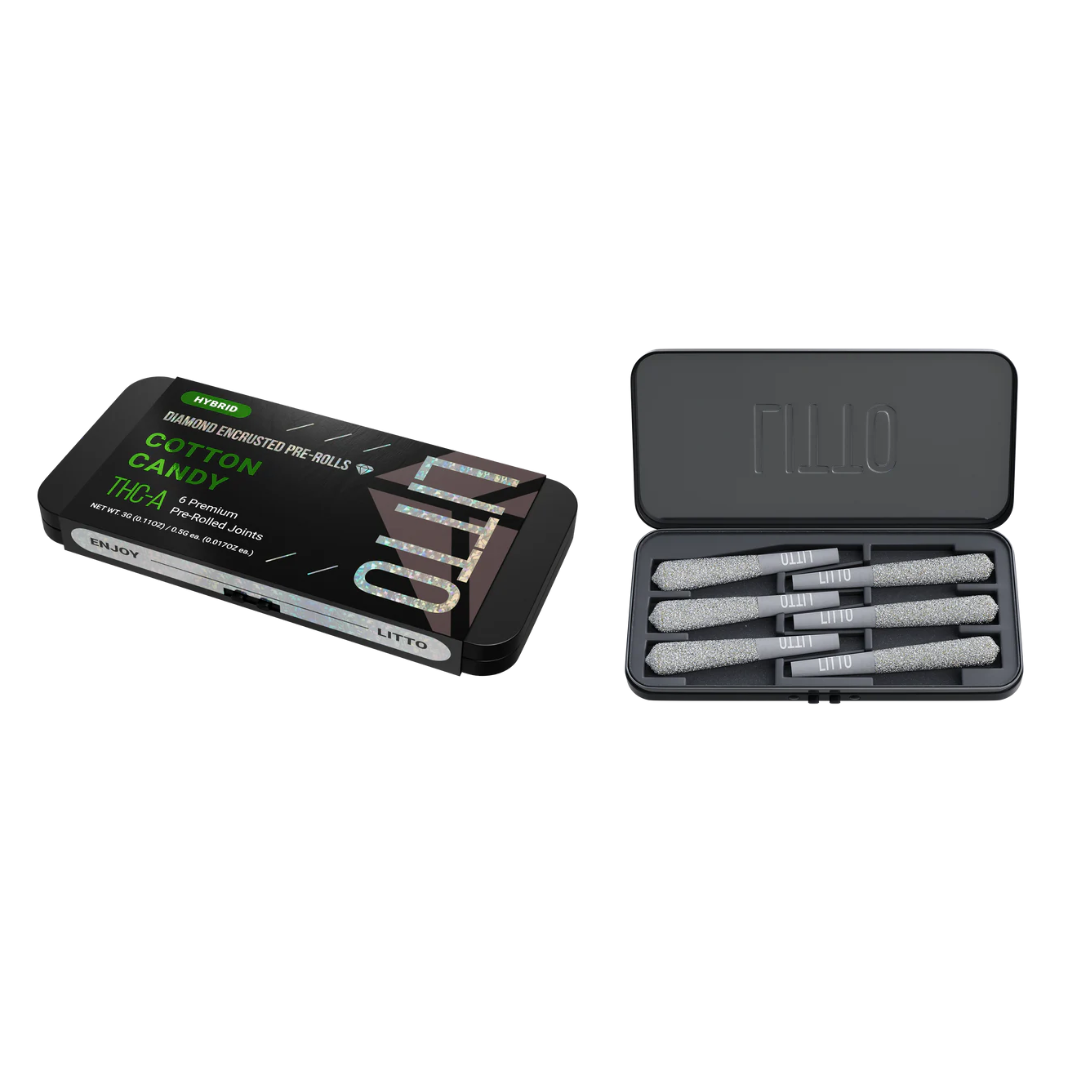 Puff on LITTO Cotton Candy Diamond Encrusted pre-rolls and begin floating on a cloud! Filled with a premium Hybrid blend made from the finest hemp and encrusted with diamonds, these Cotton Candy pre-rolls will have you just right to float on throughout the day!