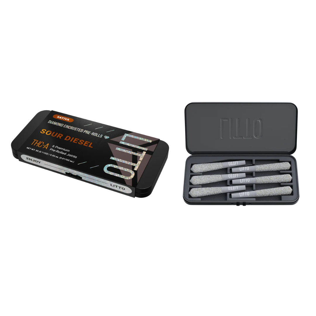 Enter euphoria with LITTO Sour Diesel Diamond Encrusted pre-rolls, packed with the finest hemp flower, and coated with a diamond-like shine, these pre-rolls bring luxury to the next level! Enjoy a Sativa-driven burst of energy with rich, pungent aromas and flavors. This Sativa strain is perfect for those who are looking for an elevated state of mind and increased energy.